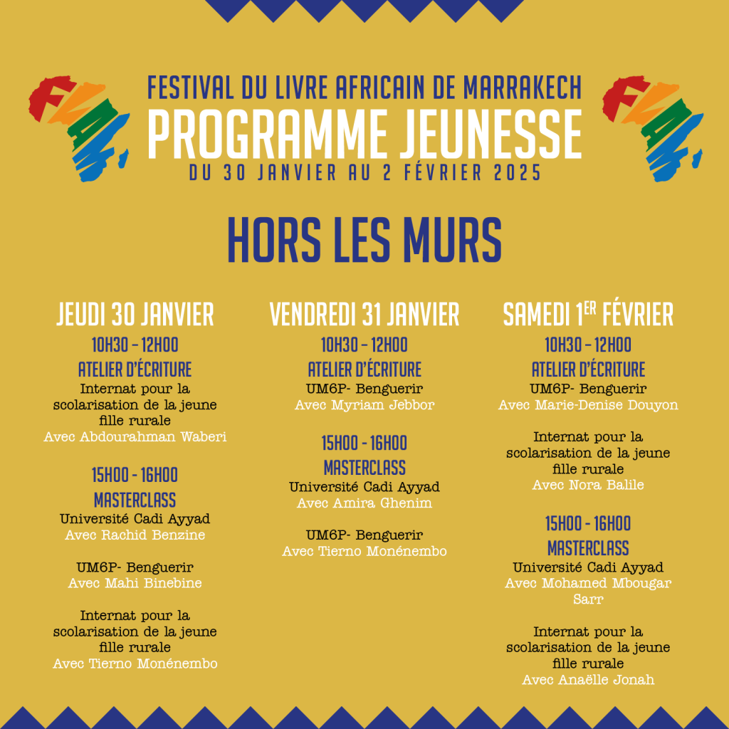 Combien d’entre nous n’avions rêvé de passer un moment avec un écrivain pour discuter avec lui en toute convivialité, sans artifices ni le brouhaha des salons du livre, sans prérequis de lecture ou de connaissance de l’œuvre ? C’est possible au FLAM. Et même mieux : nous invitons le jeune public à venir échanger, se faire dédicacer des livres et partager un repas et un moment tous les matins avec un écrivain pour bien commencer sa journée au festival. En toute simplicité et en toute convivialité. Et ça se passe aux Étoiles de Jamaâ el-Fna. Une opportunité unique pour les jeunes de côtoyer leurs idoles littéraires dans une ambiance chaleureuse et décontractée.